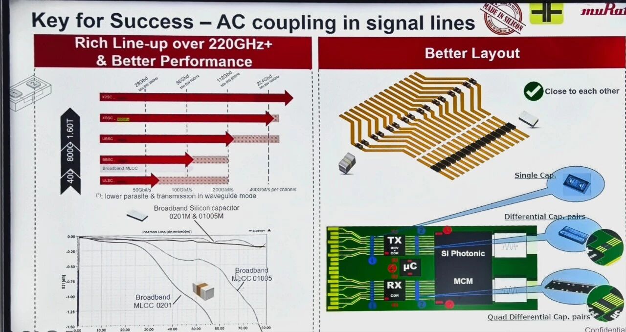 Olivier Gaborieau指出对于AI训练与推理的加速卡,硅电容提供了高密度、低功耗解决方案,使板级设计更紧凑,同时降低功耗和热管理难度。目前村田电容支持高速光模块的宽频需求,确保数据中心和通信设备在高速传输下保持稳定性能。