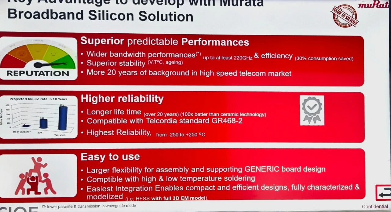 他表示在数据中心和通信模块中,功耗与温度管理尤为关键。村田硅电容可实现高达70%的功耗节省,同时具备500°C耐温能力,保证长期稳定运行,生命周期可达10年以上,远超市场平均水平。
